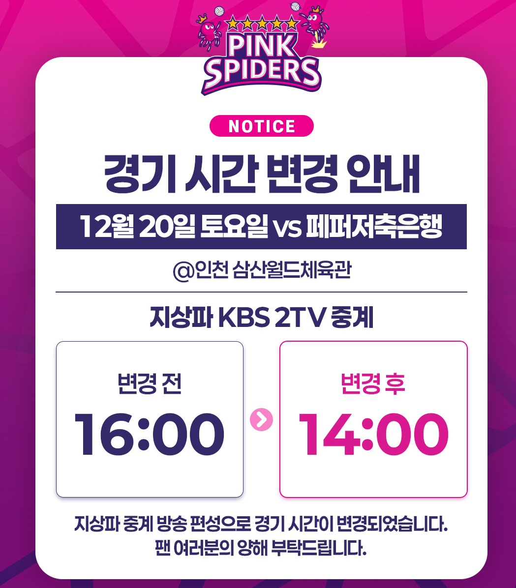 2025-26시즌 경기 시간 변경 안내(12월 20일 토요일 vs 페퍼저축은행)